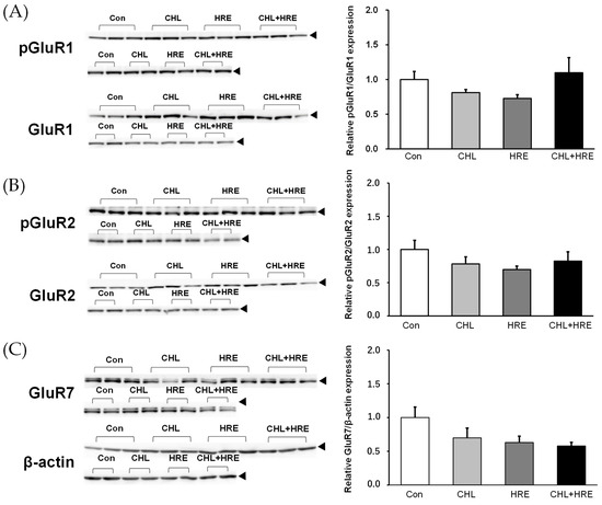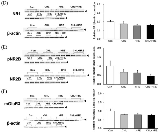 The data of glutamate receptor expression are shown in Figure 3. No significant differences were observed between the Con, CHL, HRE, and Mix groups for any of the glutamate receptor subgroups (pGluR1 (A), pGluR2 (B), GluR7 (C), NR1 (D), pNR2B (E), and mGluR3 (F) in Figure 3) investigated in this study.