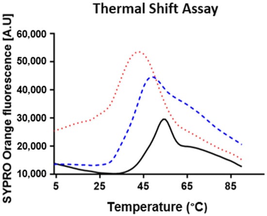 Buffer-stability analysis. The DrDyP thermal-shift assay for 0.1 M Citrate-Phosphate buffer pH 3.0, 0.1 M Britton–Robison buffer pH 3.0, and 0.05 M Tris-HCl pH 7.5/0.150 M is represented as a red dotted line, blue dashed line, and black solid line, respectively. The analysis was acquired from 4 to 90 °C.