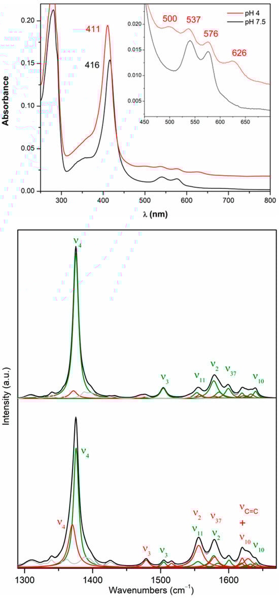 UV-Visible and RR spectra of DrDyPM190G. Top panel: UV-Vis spectra measured in BR buffer solutions adjusted to pH 7.5 (black) and 4.0 (red). The baseline of the spectrum acquired at pH 4 was vertically shifted by adding a constant value. Middle and bottom panels: Component analysis of RR spectra measured at pH 7.5 and 4.0, respectively. 6cLS and 6cHS populations are represented in green and red. Overall fit to the experimental data (gray) is depicted in black. Non-assigned bands are shown in light gray. Spectra were acquired at room temperature with 413 nm laser excitation in BR buffer solutions adjusted to different pH values.