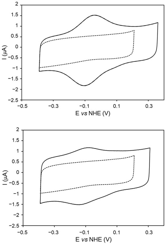 Cyclic voltammograms of DrDyP (top panel) and DrDyPM190G (bottom panel) adsorbed on pyrolytic graphite electrodes. The control electrode, prepared with protein buffer, is represented by the dashed line. Measurements performed in 50 mM KCl in BR buffer, pH 7.0, and 50 mV/s scan rate.