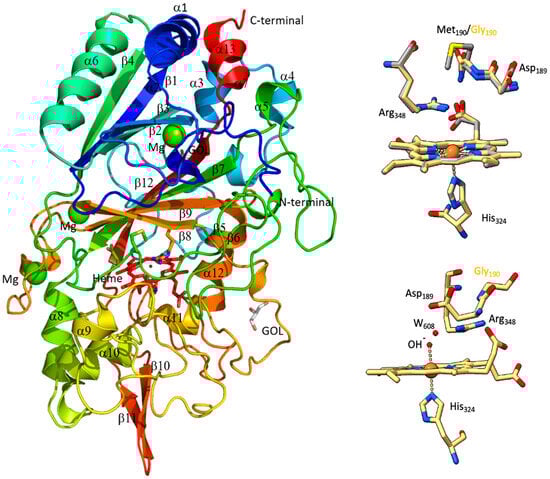 X-ray structures of DrDyP and DrDyPM190G. The overall structure of DrDyP (left panel), superimposition of hemes and catalytic residues of DrDyP (coloured) and DrDyPM190G (grey) (top right panel), and distances between the hydroxyl group and the water molecule on the distal side of heme iron (2.2 Å to OH), Asp189 (3.8 Å to dH2O) and Arg348 (2.8 Å to OH) of DrDyPM190G (bottom right panel). The distance between the hydroxyl group and the water molecule is 2.4 Å. The Figures were prepared with PyMOL Version 1.3 (https://pymol.org/2/, 1 November 2023).