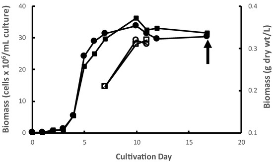 Growth curves of M. inermum in duplicate 1000 L PBRs. Accumulation of microalgae cells in PBR 1 (filled circles) and PBR 2 (filled squares). Corresponding accumulation of biomass dry weight in PBR 1 (open circles) and PBR 2 (open squares) on days 7, 10, and 11.