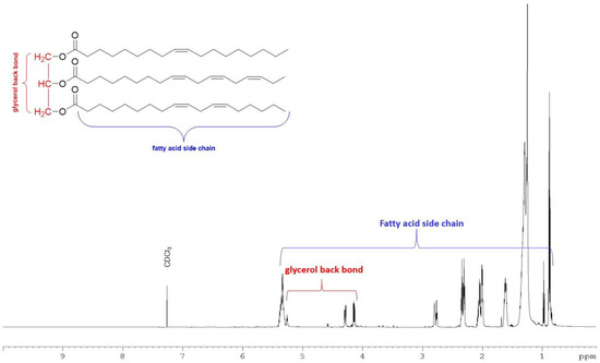1H NMR spectrum of neutral lipid fraction eluted with chloroform in SPE recorded in 700 MHz NMR with CDCl3 with a representative structure of TAG.