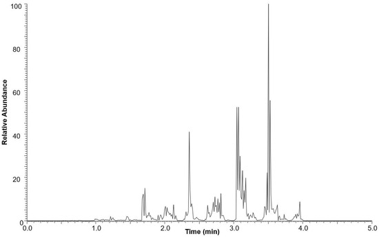 The neutral lipid fraction was further analyzed for triacylglycerol content using ultra-high-performance liquid chromatography high-resolution mass spectrometry (UHPLC-HRMS). The total ion current (TIC) chromatogram of the neutral lipid fraction is shown in Figure 3. TAGs were eluted between 1.0 and 5.0 min.