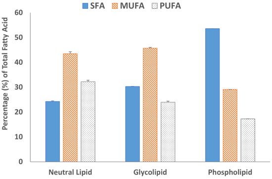 Percentage distribution of saturated fatty acid (SFA), monosaturated fatty acids (MUFA), and polyunsaturated fatty acid (PUFA) in the lipid fractions. Data are from duplicate experiments, except for the phospholipid fraction, which was carried out in a single experiment.