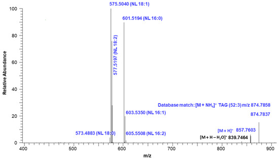 Figure 7 shows the extracted ion intensity of a TAG with [M + NH4]+ ion at m/z 874.7837, which was matched with the TAG database (C52:3) with m/z 874.7858 [33]. The major fragments observed in the MSMS spectra represent the neutral losses of fatty acids from the glyceride backbone. For example, the precursor ion at m/z 874.7837 first lost an ammonium adduct and further gave major fragments at m/z 601.5194, 577.5197, and 575.5040, representing the neutral loss of fatty acids16:0, 18:2, and 18:1, respectively (Figure 8). These fragment ions lead to the conclusion that the structure of the TAG is 18:2/18:1/16:0. Minor ion peaks at m/z 605.5508, 603.5350, and 573.4883 due to neutral loss of 16:2, 16:1, and 18:0 fatty acids further suggested the presence of TAGs 18:2/18:0/16:1 and 18:0/18:1/16:2 in lower abundance having identical molecular ion and retention time as the major TAG 18:2/18:1/16:0. The structure of a TAG with a molecular ion at m/z 900.7989 was identified as a mixture of 18:2/18:2/18:0 (major) and 18:3/18:1/18:0 (minor) based on the fragment ion observed (Figure S7). Similarly, a TAG with molecular ion at m/z 848.7686 was identified as a mixture of 18:2/16:0/16:0 and 18:1/16:1/16:0 (Figure S8). Determination of the position of individual fatty acyl chains within the glyceride backbone was outside the scope of this study. A series of minor unknown TAGs with molecular ion [M + NH4]+ peaks at m/z 930.7733, 932.7922, and 934.8069 were also detected and matched with the database A molecular mass suggested that one or more fatty acid side chains may have total two hydroxy groups. An MSMS spectrum of one of the TAGs with a molecular ion at m/z 930.7733 is shown in Figure S9.