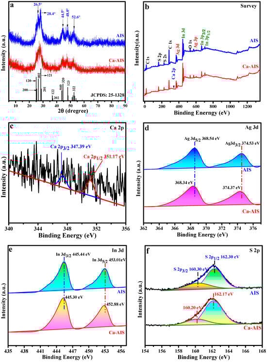 (a) XRD patterns of AIS and 1%Ca-AIS, (b) survey XPS spectrum and high-resolution XPS spectrum of AIS and 1%Ca-AIS: (c) Ca 2p; (d) Ag 3d; (e) In 3d; (f) S 2p.