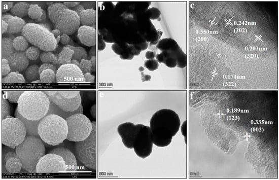 SEM, TEM, and HRTEM images of AIS (a–c) and 1%Ca-AIS (d–f).