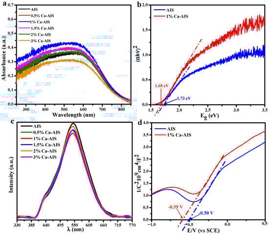 To evaluate the capacity of the samples to absorb visible light, UV-vis DRS characterizations of the samples were conducted. As depicted in Figure 4a, it is evident that Ca-AIS proportions demonstrate significant light absorption within the 400–700 nm range. Except for 3%Ca-AIS, which shows lower light absorption capacity compared to AIS, the other proportions of Ca-AIS demonstrate higher light absorption capacity than AIS, indicating that the introduction of the appropriate amount of Ca2+ is indeed conducive to the absorption of visible light. However, excessive Ca2+ will inhibit its optical utilization. The bandgap widths of AIS and 1%Ca-AIS were calculated according to Tauc’s function by the Kubelka–Munk (KM) method: αhν = A(hν − Eg)n/2, where α is the absorbance coefficient of the substance, h is the Planck constant, A is the absorbance of the sample, Eg is the forbidden bandgap width of the substance, ν is the photon frequency [,], and n is equal to 1 or 4, and its value depends on the direct or indirect type conversion of the semiconductor. As we all know, AgInS2 belongs to the direct transition semiconductor, and the value of n is 1 []. The relationship between (αhν)2 and hν is illustrated in Figure 4b. By estimating and calculating the intercept of the tangent line with the curve, the band gap value (Eg) was determined as the point where the tangent intersects the x-axis, and it is obtained that the band gap energy (~1.68 eV) of 1%Ca-AIS is lower than AIS (~1.73 eV). Therefore, the enhanced photocatalytic efficiency of 1%Ca-AIS may be attributed to its strong light absorption.
