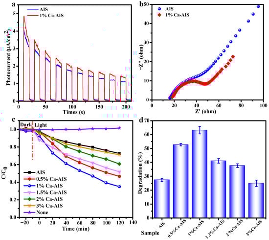 An examination of electrochemical impedance through the utilization of the “AC impedance” approach was conducted. The open circuit potential served as the primary voltage, maintaining stability throughout the testing process. For this particular experiment, a solution of 0.1 mol/L KCl incorporating 5 mm K3[Fe(CN)6] and K4[Fe(CN)6] was selected as the electrolyte solution. Figure 5b shows the EIS Nyquist curve obtained from this test. The charge transfer process occurring at the interface between the electrode and the electrolyte can be depicted by the arc observed in the EIS Nyquist curve. Typically, a decrease in the radius of the arc indicates a lower transfer resistance for carriers, thereby leading to enhanced separation and transmission efficiency of photogenerated electrons and holes []. The EIS Nyquist diagram reveals that the arc radius of 1%Ca-AIS is smaller compared to AIS. This signifies that the addition of Ca2+ improves electronic conductivity. It achieves this by efficiently segregating photogenerated carriers and promoting the swift transfer of interface charges to enhance the overall conductivity. Consequently, 1%Ca-AIS exhibits higher electronic conductivity and realizes the rapid transfer of interface charges, thus showing better photocatalytic activity.