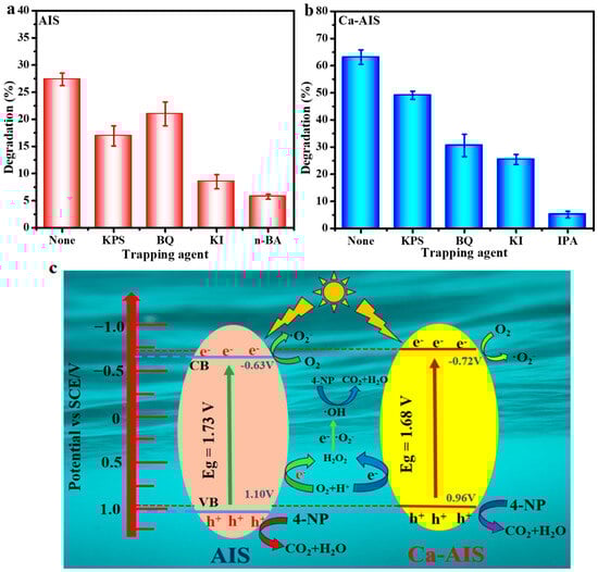 Photodegradation rates of 4-NP by (a) AIS and (b) 1%Ca-AIS with different active trapping agents and a photocatalysis mechanism diagram under visible light irradiation (c).