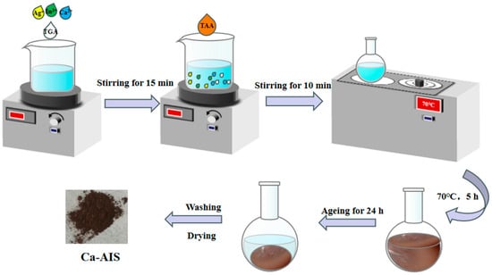 Ca-AIS: For the preparation of Ca-doped AIS, the same procedure was followed, except Ca(NO3)2·4H2O was added to form a mixed solution of AgNO3, In(NO3)3·xH2O and Ca(NO3)2·4H2O with different mass ratios (m (Ca(NO3)2·4H2O):m (AgNO3 + In (NO3)3·xH2O) = x%). The addition of Ca(NO3)2·4H2O was just before the addition of TAA to obtain Ca-AIS with mass ratios of 0.5%, 1%, 1.5%, 2%, and 3%. The synthesis roadmap of Ca-AIS is shown in Figure 7.