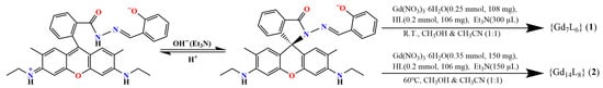 Rhodamine 6G-type ligands have attracted significant attention in the realm of fluorescent sensors. Previous studies have primarily focused on the synthesis of mononuclear rare earth or transition metal complexes [46,47,48,49,50,51,52]. However, these ligands have yet to be fully unearthed. We speculate that the reaction between LnIII and the rhodamine 6G ligands might lead to high-nuclearity lanthanide complexes under high pH values. Using the hydrolysis strategy, we have successfully synthesized two new GdIII clusters, 1 and 2 (Figure 1). Additionally, our research has unveiled the influential factors that impact the synthesis process, including the ratio of central ions to ligands, solvents, alkalines and reaction temperature.