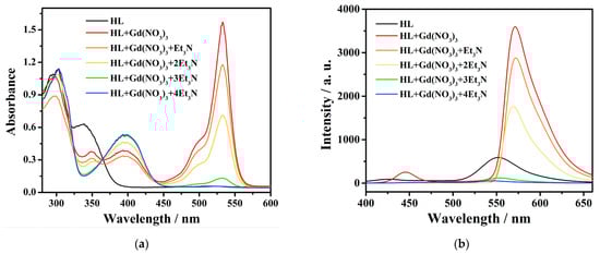 The synthetic procedure for the two clusters is similar, with the exception of the molar ratio of Gd:L, i.e., an excess amount of gadolinium nitrate was used in the synthesis of {Gd14}. Both complexes were prepared using the reaction of the ligand HL with gadolinium nitrate in a mixed solution of methanol and acetonitrile. A quantity of triethylamine was used to induce the ring closure of the HL and hydrolysis, which was characterized using the UV-Vis spectra of the reactant mixtures (Figure 2). The absorption at 535 nm due to the ring-opened xanthene disappeared after the addition of four times the amount of Et3N, revealing that the HL ligands were ring-closed [46,47,48]. The peak at 400 nm is most likely due to the conjugated salicylaldehyde hydrazone group, corresponding to the yellow color of the final products. The resulting mixture was left undisturbed at room temperature for one week, facilitating the formation of yellow plate-like single crystals for {Gd7}. The reactant mixture was heated at 60 °C in an oven for three days, resulting in the formation of yellow cubic-shaped samples of {Gd14}. These two complexes tend to lose solvents in the air. When the crystals are taken out of the solution, they turn from yellow to red at room temperature, and they lose their crystallinity. The powder XRD pattern for Gd7 illustrates that the main strong peaks show disagreement with those simulated, indicating the desolvation of the crystals (Figure S1). Thermogravimetric analysis (TGA) shows that the crystals lose all their crystallization solvent molecules to give a desolvated solid (Figure S2). The peaks at low 2θ angles in the PXRD data for Gd14 are approximately consistent with those simulated, and the TGA data show a weight loss of 8.5% in the temperature range 41–112 °C, which is in agreement with the calculated data of 7.7%. The infrared spectra of complexes 1 and 2 (Figure S3) show peaks at 1363 cm−1 and 1380 cm−1, respectively, as is characteristic of nitrate anions. The disappearance of the peak at 1680 cm−1 for HL illustrates the coordination of aryl oxygen toward GdIII. The strong peak at 1620 cm−1 is most likely due to the C=N stretching vibration for the Schiff base ligand L−. The UV-Vis and fluorescent spectra (Figure 2) for the reactant solutions of HL and Gd(NO3)3 with different amounts of Et3N were measured in the methanolic solution ([HL] = [Gd3+] = 10 μM, λex = 354 nm). The colorless ligand shows no absorption in the visible region; however, after the addition of GdIII, the ligand becomes ring-opened owing to the coordination and has a strong typical absorption at 533 nm. With the addition of Et3N, the absorption gradually decreases owing to the ring-closure of HL in alkaline conditions. The free ligand HL in MeOH has an emission at 555 nm, which is due to the presence of small quantities of the ring-opened ligand. After the addition of GdIII, the ligand HL becomes ring-opened, and emits yellow light with a wavelength of 580 nm. When three times the amount of Et3N was added, the emission nearly disappeared, indicating that almost all the HL ligands were in the ring-closed form. The complexes are slightly soluble in MeOH, and the solutions (10 μM) show an intense absorption at 398 nm, corresponding to the yellow color of the complex with ring-closed L− ligands (Figure S4a). The emissions at 546 nm for Gd7 and 550 nm for Gd14 (λex = 354 nm) potentially come from the ring-opened xanthene in the complexes, and although the ring-opened dissociation is scant, the emission is strong. The weak emission at 484 for Gd7 and 489 nm for Gd14 is most likely due to the Schiff base part of the ligand L− (Figure S4b).