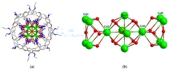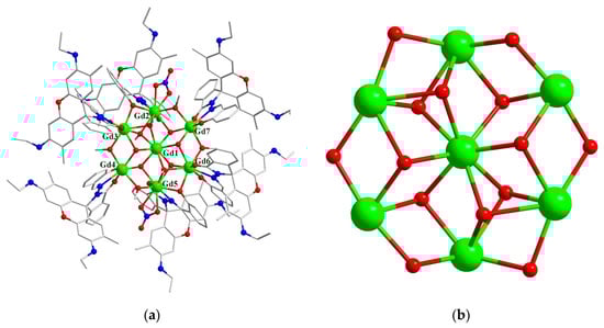 A yellow single crystal of complex 1 was selected for single crystal X-ray diffraction at 100 K. Complex 1 crystallizes in the monoclinic system with the P21/n space group. The volume of the unit cell is very large with a monoclinic system, and therefore the diffraction data are not optimal. The command MASK was used during the structural refinement, and 452 electrons were masked per formula unit, which account for the missing NO3− anion and 10 acetonitrile, 10 methanol and 2 H2O molecules, with their total electrons being 451. The crystallographic data and selected bond distances and angles are given in Tables S1 and S2. The asymmetric unit cell contains three crystallographically independent {GdIII7} moieties. Because they have similar molecular structures, only one of them is described in detail as a representative. The coordination number of each GdIII ion in {Gd7} (Figure 3) is between 7 and 9. Their coordination patterns are shown in Figures S5 and S6. Using the SHAPE software (version 2.1) for calculation, their coordination patterns were obtained, as shown in Tables S3–S5. The central Gd1 ions are coordinated by eight oxygen atoms and have a square antiprism structure D4d. Among the eight oxygen atoms, four are μ3-OH− and another four are μ3-CH3O−. The Gd–Ohydroxy bond distances are in the range of 2.316(9)–2.358(9) Å, slightly shorter than that of the Gd–Omethoxy bonds (2.362(9)–2.404(6) Å). The remaining six GdIII ions are evenly distributed around the central GdIII ion, forming a saddle-shaped structure, which is relatively rare in rare earth complexes [53] (Figure S7). Each peripheral GdIII ion is chelated by one ring-closed ligand L−, and is bridged to the adjacent peripheral GdIII ions by μ2-CH3O− or phenoxy oxygen atoms (Figure 4). The Gd–Omethoxy bond distances are in the range of 2.261(10)–2.298(10) Å, comparable to that of the Gd–Ophenoxy bonds (2.189(10)–2.433(9) Å). The central GdIII ion is connected to the six peripheral GdIII ions via the μ3-OH− and μ3-CH3O− bridges, giving rise to a Gd7 core, as shown in Figure 3b. The bridging Gd–O–Gd bond angles are in the range of 92.9(3)–110.6(4)° for μ3-OH−, 92.9(3)–99.2(3)° for μ3-CH3O−, 110.4(4)–112.8(4)° for μ2-CH3O− and 98.2(3)–98.4(3)° for μ2-Ophenoxy, respectively, with intramolecular Gd–Gd separations of 3.5064(11)–3.808(11) Å. The neighboring Gd7 molecules are connected via weak intermolecular forces and no obvious intermolecular hydrogen bonds are found based on the squeezed model of the crystal data.