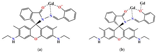 Schematic diagram of two different coordination modes of ring-closed rhodamine ligands L−. (a) Tridentate chelating mode; (b) phenolic oxygen bridging mode.