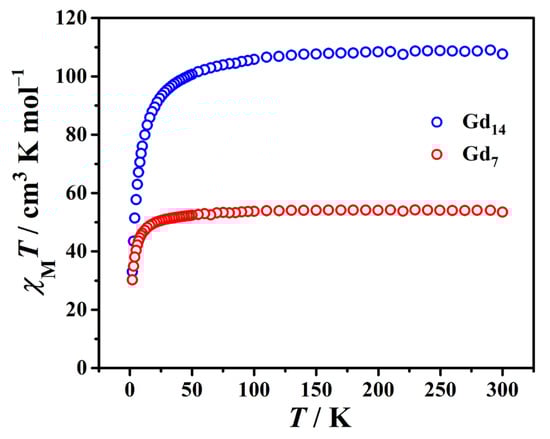 Temperature dependence of χMT for {Gd7} and {Gd14} under a 1000 Oe magnetic field in the range of 2–300 K.