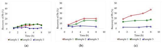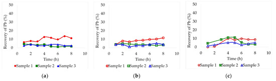 By carrying out the test with a temperature of 60 °C, lead leaching on sample 1 was favored by increasing its concentration on the deep eutectic solvents. Unfortunately, this increase could barely be evidenced for samples 2 and 3. There were also no significant improvements by employing ethaline as a solvent (Figure 2a). Sample 1 presented the highest recoveries, around 37.3% after 8 h in reline and 19.6% after 5 h in glyceline (Figure 2b,c). Sample 2 achieved maximum recoveries at the same times, 8 h in reline and 5 h in glyceline, 17.7% and 15.6%, respectively. At this temperature, reline proved to be the most effective deep eutectic solvent.
