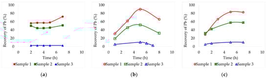 Leaching recovery of Pb (%) from the three different lead slag samples by lixiviation at 30 °C employing different deep eutectic solvents: (a) Ethaline, (b) Glyceline, (c) Reline. Pulp concentration = 2%.