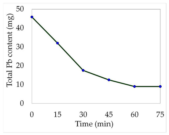 Figure 4 provides a graphical representation of the decrease in lead concentration over time during the electrowinning process. This reduction can be attributed to the lead recovery on the cathode or by the precipitation of the valuable metal towards the anode sludge. Between 60 and 75 min, the total lead content remained constant (9 mg). It is reasonable to assume that the maximum recovery had already been achieved by this point in time.