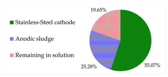 The distribution of the total lead content throughout the electrowinning process was assessed. Within just 60 min, the lead concentration in the leachate decreased significantly, with only 19.7% of the total content remaining in the solution. This demonstrated that the electrodeposition process occurs rapidly under the current conditions employed. However, the total recovery of reduced lead at the cathode was only 55.1%, and a considerable amount precipitated to the anode sludge (25.3%). The electrowinning test results are displayed in Figure 5.