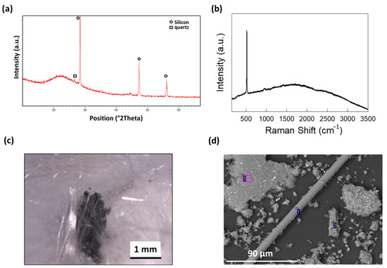 Waste Printed Circuit Boards (WPCBs) were collected and treated through acidic leaching assisted by microwave heating, as reported in the Materials and Methods section (Section 3), to obtain a solid fraction (MW-treated WPCBs) depleted of metal components and epoxydic resin. The obtained material was analyzed through X-ray diffraction and Raman Spectroscopy to obtain information about its specific chemical composition. As visible from Figure 2a, it was mainly composed of an amorphous fraction, ascribed to amorphous SiO2 (glass), and crystalline Si, whose diffraction peaks were visible at 2θ = 28.4°, 47.3°, and 56.1°. A small contribution to the diffraction pattern came also from quartz (crystallin SiO2), with a small peak centered at 2θ = 26.6°.