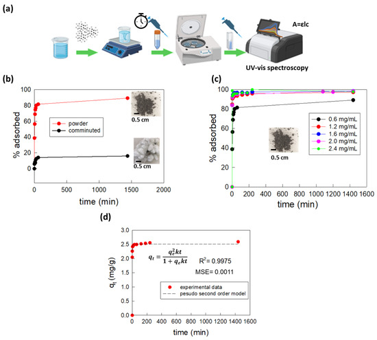 Investigation of the adsorption process of MB (10−5 M) on MW-treated WPCB samples at pH = 7.5: (a) schematic representation of the adsorption experiments, in accordance with what is described in the Materials and Methods section (Section 3); (b) comparison between the percentages of adsorbed MB 10−5 M in the time interval 0–24 h, using as the adsorbent MW-treated WPCB samples with different granulometry: comminuted fragments of 0.3 cm2 (blackline) or fine powder with granulometry <500 μm (red line); (c) comparison between the percentages of adsorbed MB 10−5 M in the time interval 0–24 h using different amounts of powder derived from MW-treated WPCBs; (d) variation in the adsorption capacity of the powder derived from MW-treated WPCBs at the dosage of 1.2 mg/L as a function of soaking time inside the MB 10−5 M solution. Points represent the experimental data, while the dashed line represents the results of the fitting using the non-linearized form of the pseudo-second-order model. The high value of the correlation coefficient (R2) and the low value of the mean sum of squares error (MSE) indicate the goodness of the fit. All the experiments were conducted in triplicate; error bars are included inside dots’ size. Figure 3a was created with BioRender.com, accessed on 10 January 2024.