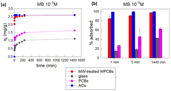 Comparison between the adsorption capacity of MW-treated WPCB powder and those of reference materials (ACs, glass powder, and ground untreated PCBs) during the adsorption of MB (10−5 M): (a) variation in adsorption capacities as a function of time in relation to MB 10−5 M; (b) comparison between the percentage of adsorbed MB 10−5 M at selected time intervals. All the experiments were conducted in triplicate, where non-visible error bars are included inside dots’ size.