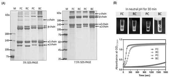 We characterized the tilapia skin collagen (FC) by comparing it with other commercial type I collagens, namely a rat tail collagen (RC), porcine skin collagen (PC), and bovine skin collagen (BC). The collagen composition was analyzed by SDS-PAGE, and the band profile of FC showed α1, α2, β, and γ chains without any degradation forms, resembling the patterns observed for RC, PC, and BC (Figure 1A). Next, we adjusted the collagen solution to a concentration of 1 mg/mL at a neutral pH to induce fibril formation. Notably, FC completed fibril formation within 5 min, a significantly faster process than RC, which took approximately 10 min. In contrast, BC and PC displayed slow and no fibril formation within the first 30 min, respectively (Figure 1B). This observed variation in fibril formation kinetics may be attributed to different collagen extraction methods, such as acidic, enzymatic, and alkaline extraction, which can influence the collagen structure and self-assembly differentially [14]. A complete fibril formation of BC or PC was only observed when collagen concentrations were increased to 2 or 3 mg/mL, respectively (Figures S1 and S2). Indeed, the intact molecular structure observed in FC is likely attributable to its manufacturing process involving acid solubilization.