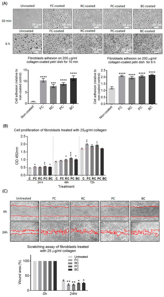 Evaluating the effects of the FC on cell adhesion, proliferation, and migration in a human skin fibroblast cell line compared to RC, PC, and BC. (A) The fibroblasts were seeded on the Petridishes coated with or without collagen (0.2 mg/mL). After washing gently, adherent cells were stained and counted under a microscope. The histogram shows the relative cell adhesion on the collagen-coated dish compared to the uncoated one. (B) The fibroblasts were seeded in a 96-well plate and treated with or without different collagen (25 μg/mL) for 24, 48, or 72 h. The supernatants were replaced with fresh medium containing CCK8 reagent to evaluate cell proliferation by measuring the absorbance at OD450 nm. (C) A cell monolayer of the fibroblasts was scratched and replaced with fresh medium containing different collagen (25 μg/mL) or no collagen. The scratched areas were recorded at 0 and 24 h and quantified using ImageJ 1.52q software. The percentage of wound area with or without the collagen treatment was shown in the histogram. Significance differences analyzed by one-way ANOVA were indicated as * p < 0.05; ** p < 0.01; *** p < 0.001; **** p < 0.0001.