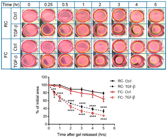 TGF-β is recognized for its ability to drive the differentiation of fibroblasts into myofibroblasts, a contractile and matrix-preserving cell type, which is pivotal in processes such as tissue repair, wound contractions, and fibrosis [24]. The fibroblasts embedded in the FC or RC gel were treated with or without TGF-β under the release of collagen gels from the sides of culture dishes. We found that the untreated fibroblasts exhibited a higher level of contraction in the FC gel compared to the RC gel. However, when treated with TGF-β, both collagen gels showed contractions at the same level (Figure 4). This means that FC gel is suitable for fibroblast-induced gel contractions with or without the presence of TGF-β.
