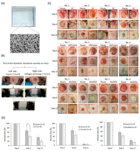 The effect of the tilapia skin collagen freeze-dried scaffold on excisional wound healing. (A) The fish skin collagen solution was freeze-dried in a mold, forming a collagen scaffold with a porous structure, which was observed by scanning electron microscopy (SEM). (B) Two 8 mm full-thickness excisional wounds were created on the same dorsal region of a mouse. The left-side wound was covered with gauze, while the right was covered with collagen dressings made from tilapia skin collagen (FC), LifeFusion, or HealiAid. The dressings were secured using Tegaderm and a bandage. On day 6, both the gauze and the collagen dressings were replaced. (C,D) The wound area was recorded using a digital camera on days 0, 6, and 12 and subsequently measured using ImageJ software. The Student’s t-test was employed to determine the statistical significance between the two groups. Statistical significance analyzed by Student’s t-test was indicated as * p < 0.05.
