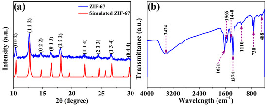 XRD pattern (a) and FT-IR spectra (b) of obtained ZIF-67 material.