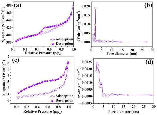 (a,c) N2 adsorption–desorption isotherms of ZIF-67 nanoparticles and ZIF-67-PU, respectively; (b,d) pore size distribution plots of ZIF-67 nanoparticles and ZIF-67-PU calculated using the BJH method.