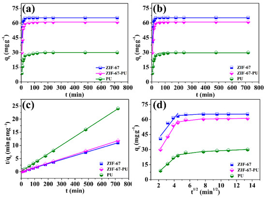 To compare the elimination efficiency between ZIF-67 and ZIF-67-PU, the impact of operation time on U(VI) elimination by the obtained samples (i.e., ZIF-67, PU and ZIF-67-PU) was experimentally studied. As can be seen from Figure 4, all the obtained adsorbents exhibited a relatively fast elimination rate at the beginning of the contact time and then gradually reached the adsorption equilibrium. The amount of absorbed U(VI) onto ZIF-67-PU was 63.07 mg∙g−1, which was about 2 times higher than that of PU (30.23 mg∙g−1). The ZIF-67 loaded onto sponge can greatly improve the elimination of U(VI), which can be ascribed to the increased active sites from ZIF-67. The dynamic processes were further analyzed using pseudo-first-order models, pseudo-second-order models, and intra-particle diffusion models to deepen our understanding of the elimination process [32,33,34]. The detailed descriptions of the above three kinetic models are summarized in Table S1. And the fitting results are shown in Figure 4b–d and Table 2. It can be seen that the adsorption kinetics of U(VI) onto the obtained adsorbents were fitted better by the pseudo-second-order model than the pseudo-first-order model due to its higher correlation coefficient (R2 > 0.999) and closer calculated value (qe,cal) to the experimental value (qe,exp), further corroborating the dominant chemisorption/surface complexation mechanism for U(VI) adsorption onto the obtained ZIF-sponges.