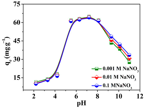 The impacts of ion strength on the process of U(VI) elimination by ZIF-67-PU were measured using different concentrations of NaNO3 over a wide range of solution pH values. From Figure 5, it can be seen that the ionic strength had a low impact on the U(VI) elimination process carried out by ZIF-67-PU when the pH of the solution was less than 8, which revealed that the interaction mechanism was primarily inner-sphere surface complexation [35]. However, an increase in ion strength was beneficial to improving the adsorption performance of U(VI) onto ZIF-67-PU when the pH of the solution exceeded 8, suggesting an out-sphere surface complexation mechanism. Based on previous studies [36,37,38], the concentration of the background liquid ions could substantially impact the thickness of the diffused electric double coating as well as the potential of the substances, impacting the binding of U(VI) to different materials. Generally speaking, the inner-sphere complexation interaction was more insusceptible to the alterations of the background ions in comparison with the outer-sphere complexation reaction. Although ion strength has a positive effect on U(VI) adsorption at higher pH values, there was no significant difference in the total adsorption efficiency of U(VI), indicating that U(VI) elimination onto ZIF-67-PU was mainly realized through the inner-sphere complexation between U(VI) and uncoordinated C–N(H)/–OH groups on the ZIF-67 surface rather than outer-sphere surface complexation, which was further certified by XPS analysis. Based on the above discussion, ZIF-67-PU composites are anticipated to be effective for removing U(VI) from water environments even at high salt concentrations.