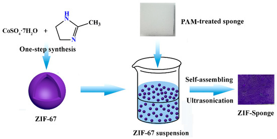 Firstly, the sponge with a size of 1 cm × 1 cm × 1 cm was cleaned several times with ethanol and deionized water, and dried in a vacuum desiccator at 60 °C for 24 h. Then, the dried sponges were clipped onto a baker containing 100 mL PAM solution with a concentration of 1 g∙L−1. The baker containing both sponges and PAM solution underwent ultrasonic treatment for 1 h to achieve PAM sedimentation on the sponge surface. Afterwards, the ZIF-67 sample with 100 mg was added into deionized water (100 mL) to prepare the ZIF-67 solution, which underwent ultrasonic processing for 30 min to achieve its uniform dispersion in deionized water. Next, the PAM-modified sponge was put into the homogeneous ZIF-67 solution, which underwent ultrasonic processing for another 3 h to realize the self-assembly of ZIF-67 and the PAM-modified sponge. Finally, the obtained ZIF-67-PU was cleaned several times with ethanol and deionized water to remove the redundant PAM molecules and dried at 60 °C.