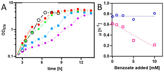(A) Growth curves of E. coli Rosetta(DE3) pLysS containing expression plasmid pASG_mod-benK in LB medium with different added benzoate concentrations (0, 1, 2.5, 5, and 10 mM in red, orange, green, blue, and purple). Gene induction was started 3 h after inoculation. The growth curve of the same strain without a plasmid in LB medium with 5 mM benzoate is shown (open black circles). (B) Growth rate dependence of E. coli containing or lacking the benK gene from added benzoate (magenta and blue, respectively).