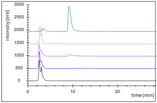 An alternative pathway for activating benzoate is represented by a succinyl-CoA:benzoate CoA-transferase present in the Fe(III)-reducing toluene- and benzoate-degrading species Geobacter metallireducens [35]. Therefore, we cloned the respective bct gene from this organism into broad host range expression vector pASG_mod [32], which provided an N-terminal streptag fusion, and produced the protein in E. coli strain Rosetta (DE3) pLys. The enzyme was purified by affinity chromatography using a streptactin column, resulting in 1.2 mg purified enzyme from a culture volume of 2 l (Figure A2). Enzyme activity was qualitatively tested by an HPLC-based assay, which was started by adding the substrates, succinyl-CoA and benzoate, followed by 10 min incubation at 30 °C. We observed the production of benzoyl-CoA at the expense of succinyl-CoA, indicating that the enzyme is sufficiently active to use it in the intended pathway (Figure 3). Because both benzoate-activating enzymes were obtained in active form, we continued to set up two separate pathways, one using the CoA ligase and the other using the CoA-transferase for benzoate activation.