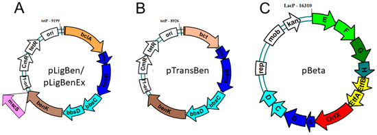 Using a Long-Range PCR method with KOD Hot Start DNA polymerase (biotechrabbit, Berlin, Germany), the genes of the entire bbs operon of G. metallireducens as well as the broad-host-range vector pBBR2 [41] were amplified, and ligated together, producing an expression plasmid of 16.3 kb containing the bbs operon behind an IPTG-inducible lac promotor (pBeta, see Figure 4).