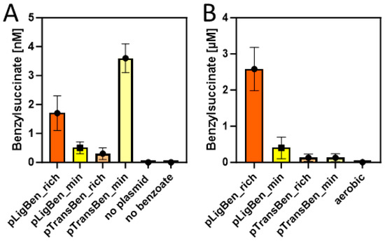 Benzylsuccinate yields in the culture supernatants of cells carrying plasmid pBeta and either pLigBen or pTransBen after three days of incubation at 15 °C in rich (orange) and minimal media (yellow). (A) Experiments under aerobic conditions with added succinate and benzoate. Results of control experiments without the plasmids or without added benzoate are included. (B) Experiments under anaerobic conditions with added glucose and benzoate. The experiment from (A) yielding the most product under aerobic conditions is added to illustrate the different scales of the graphs.