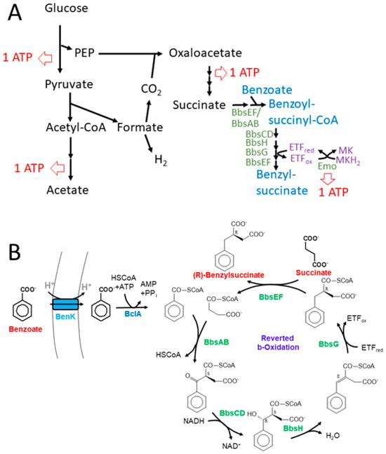 If benzylsuccinate formation is considered in a balanced equation with glucose degradation to acetate; H2 and CO2, the available energy value increases according to Equation (2), but only marginally relative to one glucose molecule. However, the formation of benzylsuccinate as an additional fermentation product may allow additional recycling of the released hydrogen or formate molecules from glucose fermentation by coupling either hydrogenase-2 [55,56] or formate dehydrogenase-N or -O of E. coli [57,58] with fumarate reductase and EMO. Under these conditions, the energy yield value per glucose can become significantly higher and may approach up to four ATP equivalents per glucose as shown in Equation (3). Therefore, benzylsuccinate production may actually be beneficial for the anaerobic growth of E. coli, and the additional costs for benzoate transport and activation should be covered by the additional gain of energy.