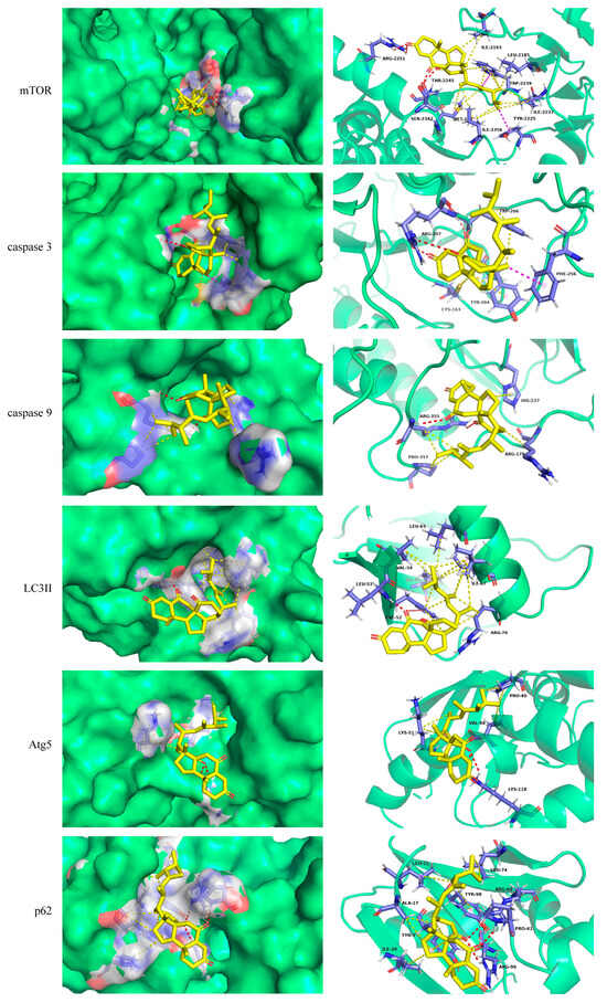 Molecular docking is an efficient methodology used to explore the behavior of small molecules in the binding site of a target protein [23]. Considering the inhibitory effect of PB on LX-2 proliferation, molecular docking was employed to predict the binding affinity of PB to the possible targets in the apoptosis and autophagy signaling pathway, and six related proteins with crystal structures were selected to dock with PB. The results displayed that PB had considerable binding activity with mTOR, caspase-3, caspase-9, Atg5, LC3II, and p62 with binding energies of −9.4, −8.1, −7.3, −6.9, −6.9, and −7.8 kcal/mol, respectively. The molecular docking details of PB with each protein are shown in Figure 2, where PB binds to mTOR through several intermolecular interactions including hydrogen bonds (ARG:2251, SER:2342, and THR:2245). Similarly, the hydrogen bonds formed between PB and caspase-3, caspase-9, Atg5, LC3II, and p62 are listed in Table 1. These results suggest that PB may directly target mTOR, caspase-3, caspase-9, LC3II, Atg5, and p62 to disrupt their interactions, which subsequently affect the apoptotic and autophagic outcomes.