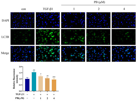 The immunofluorescence analysis of LC3-B in LX-2 cells treated with PB. ** p < 0.01 versus control; # p < 0.05, ## p < 0.01, ### p < 0.001 versus TGF-β1.