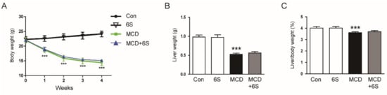 2.1. 6-Shogaol Does Not Change Body Weight, Liver Weight, and Hepatic Lipid Accumulation in MCD Diet-Fed Mice
