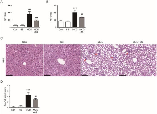 To evaluate liver injury severity, we measured the levels of alanine aminotransferase (ALT) and aspartate aminotransferase (AST) in the serum [17,18]. The MCD diet led to a significant increase in these markers, indicating substantial liver injury (p < 0.001 for both; Figure 2A,B). However, the administration of 6-shogaol effectively ameliorated the liver damage invoked by the MCD diet (p < 0.001 for ALT, p < 0.01 for AST; Figure 2A,B). Examination of liver tissues using hematoxylin and eosin (H&E) staining revealed the typical histological characteristics of NASH in MCD-diet-fed mice, including macrovesicular steatosis, inflammatory cell infiltration, and hepatocellular ballooning (Figure 2C). Notably, these changes were markedly reversed by 6-shogaol (Figure 2C). Moreover, 6-shogaol significantly alleviated the increase in the NAFLD activity score in mice exposed to the MCD diet (p < 0.01; Figure 2D).