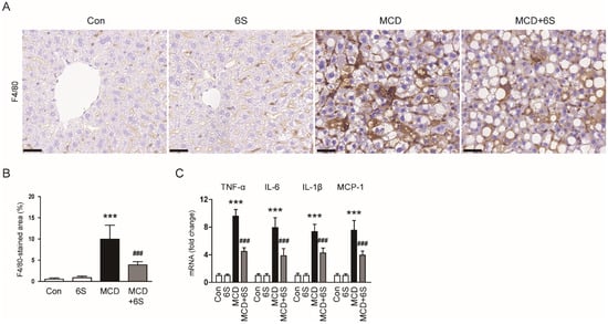 Diminishment of inflammation by 6-shogaol in MCD-diet-fed mice. (A) IHC staining of liver tissues for F4/80. Scale bar = 40 μm. (B) Percentage of areas displaying F4/80 staining. (C) mRNA expression of TNF-α, IL-6, IL-1β, and MCP-1 in liver tissues. n = 8 per group. *** p < 0.001 vs. the Con group. ### p < 0.001 vs. the MCD group.