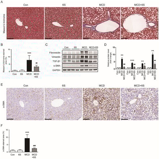 Masson’s trichrome staining of liver specimens revealed a noticeable reduction in the area showing positive collagen fiber staining in mice exposed to the MCD diet and subsequently treated with 6-shogaol (p < 0.01; Figure 4A,B). Furthermore, elevated levels of fibronectin, vimentin, and transforming growth factor-β1 (TGF-β1) proteins in mice subjected to the MCD diet were remarkably decreased following treatment with 6-shogaol (p < 0.01 for fibronectin, p < 0.01 for vimentin, p < 0.05 for TGF-β1; Figure 4C,D). Additionally, 6-shogaol treatment downregulated the protein expression of α-smooth muscle actin (α-SMA), a widely recognized marker for myofibroblasts [20,21], in mice exposed to the MCD diet (p < 0.01; Figure 4C,D). IHC staining further validated the inhibitory action of 6-shogaol on α-SMA expression (p < 0.001; Figure 4E,F).