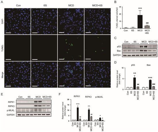 Inhibition of apoptosis and necroptosis by 6-shogaol in MCD-diet-fed mice. (A) TUNEL assay on liver tissues. Nuclei were counterstained with DAPI. Scale bar = 50 μm. (B) Number of TUNEL-stained cells. (C) Western blots displaying p53 and Bax expression in liver tissues. (D) Quantitative analysis of Western blot results. (E) Western blots displaying RIPK1, RIPK3, and p-MLKL expression in liver tissues. (F) Quantitative analysis of Western blot results. n = 8 per group. * p < 0.05, ** p < 0.01, and *** p < 0.001 vs. the Con group. # p < 0.05, ## p < 0.01, and ### p < 0.001 vs. the MCD group.