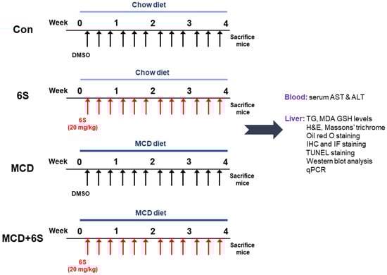 Six-week-old male C57BL/6J mice were obtained from HyoSung Science (Daegu, Republic of Korea) and acclimatized for one week in a controlled environment (20–24 °C, 12/12 h light/dark cycle) with free access to water and food. Subsequently, they were randomly assigned to four groups (n = 8 per group): Con, 6S, MCD, and MCD + 6S. The Con and 6S groups received a control diet with sufficient methionine and choline, while the MCD and MCD + 6S groups were fed an MCD diet for four weeks to induce NASH. These diets were procured from Dyets (Bethlehem, PA, USA) and their composition is detailed in prior literature [56]. The 6S and MCD + 6S groups received intraperitoneal injections of 6-shogaol (20 mg/kg; Sigma-Aldrich, St. Louis, MO, USA) three times a week concurrently with the MCD diet. To prepare the injection solution, 6-shogaol was first dissolved in dimethyl sulfoxide (DMSO) to make a stock solution. This stock solution was then diluted with phosphate-buffered saline (PBS) to attain the target concentration of 20 mg/kg for administration. The final injection solution, with a pH of 7.4, had a DMSO concentration of 2.4% (v/v). This specific concentration of DMSO was carefully chosen to ensure that 6-shogaol remained sufficiently soluble, while simultaneously minimizing any potential toxicity or irritation to the mice. The injection volume was adjusted based on each mouse’s body weight to ensure accurate dosing. Meanwhile, the Con and MCD groups received an equivalent volume of the vehicle during the same period. The dosage of 6-shogaol was determined based on established studies [10,45]. The body weight of each mouse was monitored weekly throughout the experiment. At the end of the experiment, all the mice were euthanized and blood samples were collected via cardiac puncture. At the same time, liver tissues were weighed and collected for a subsequent analysis. Our experimental design and methodologies are summarized in Figure 8. The Institutional Animal Care and Use Committee of Daegu Catholic University Medical Center approved our experimental protocol (DCIAFCR-220628-11-Y).